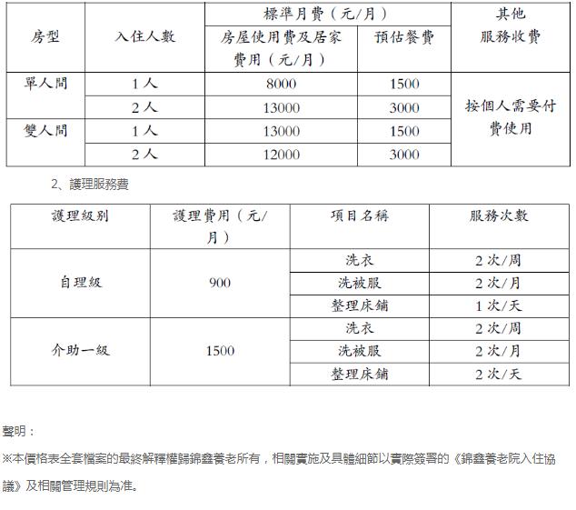 入住錦鑫養老院,您需要交納入住保證金、月費。本價格表適用至發文之日起至新價格發佈之日止。